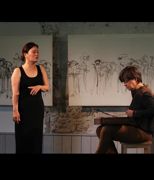 Une femme, éventail à la main, chante un poème rythmé par les interjections du tambour. C’est dans les rituels chamaniques que le pansori, l’opéra traditionnel coréen, puise ses sources et son incroyable puissance d’évocation. La chanteuse Cho Joo-Seon est le vivant passeur de cet art ancestral qui a, comme souvent, inspiré une artiste d’aujourd’hui : la compositrice Marie-Hélène Bernard, friande des croisements de disciplines et des transferts artistiques orient-occident, se nourrit du pansori pour (mé)tisser la poésie des mots, la puissance des rythmes et le timbre de la voix. Un travail de création mené dans le cadre d’une résidence 2013 de la Villa Medicis et interprété ici avec la percussionniste Françoise Rivalland, elle-même grande figure du théâtre musical aux côtés de Georges Aperghis.